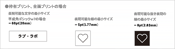 一般的な平成ゴシックw7の場合フォントサイズは60pt(20mm)・線の太さは5pt(1.77mm)以上・抜き表現の太さは8pt(2.83mm)以上となります。但し、デザインの内容や画数の多い漢字・プリントの種類によってはつぶれて読みづらくなってしまうことがございます。