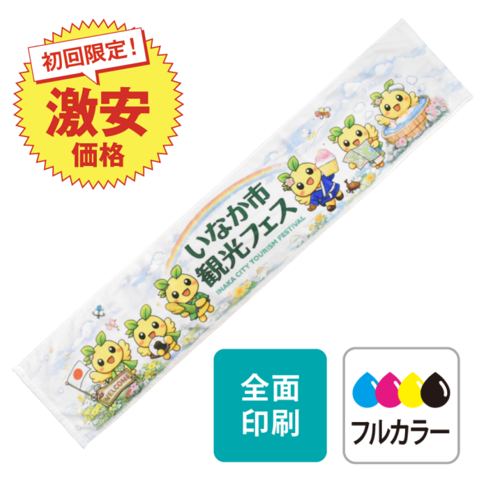 全面にフルカラーでプリント可能なタオルが今だけの特別大特価!写真やグラデーションなどのフルカラーデザインの表現が可能なインクジェットというプリント方法です。まずはお気軽にお問合せください。
